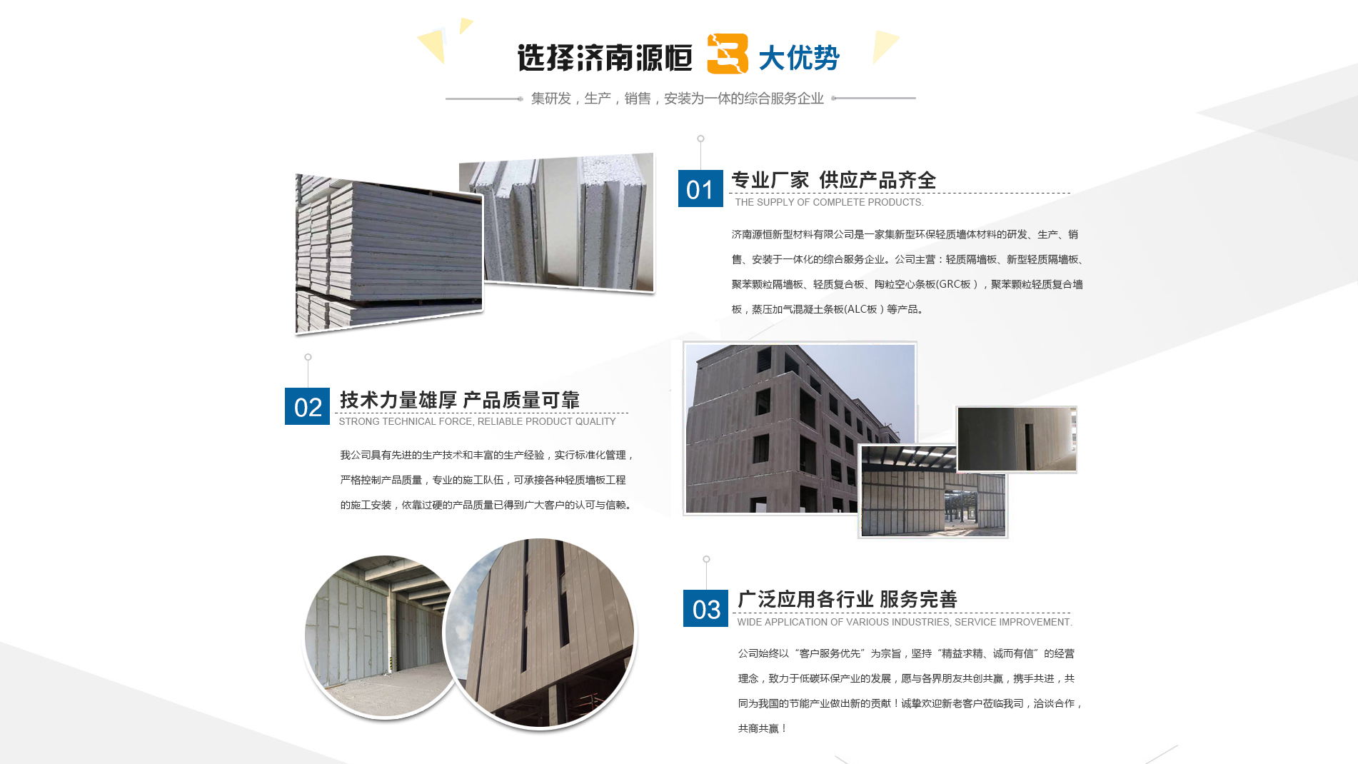 濟(jì)南源恒新型材料有限公司坐落于美麗的泉城濟(jì)南,是集新型環(huán)保輕質(zhì)墻體材料的研發(fā)、生產(chǎn)、銷(xiāo)售、安裝于一體化的綜合服務(wù)企業(yè)。我公司具有的生產(chǎn)技術(shù)和豐富的生產(chǎn)經(jīng)驗(yàn),為您提供輕質(zhì)隔墻板、新型輕質(zhì)隔墻板、聚苯顆粒隔墻板、輕質(zhì)復(fù)合板、陶粒空心條板(GRC板),聚苯顆粒輕質(zhì)復(fù)合墻板,蒸壓加氣混凝土條板(ALC板)等產(chǎn)品,本公司有專(zhuān)的施工隊(duì)伍,可承接各種輕質(zhì)墻板工程的施工安裝。輕質(zhì)隔墻板是國(guó)家推廣使用的新型輕質(zhì)、綠色無(wú)害建材,是墻改節(jié)能政策大力扶持的環(huán)保節(jié)能產(chǎn)品,是發(fā)達(dá)國(guó)家普遍采用的新型墻體材料。濟(jì)南源恒新型材料有限公司實(shí)行標(biāo)準(zhǔn)化管理,嚴(yán)格控制產(chǎn)品質(zhì)量,依靠過(guò)硬的產(chǎn)品質(zhì)量已得到廣大客戶的認(rèn)可與信賴(lài)。公司產(chǎn)品遍布各大城市,與國(guó)內(nèi)多家客戶建立了良好的合作關(guān)系。公司始終以“客戶服務(wù)優(yōu)先”為宗旨,堅(jiān)持“精益求精、誠(chéng)而有信”的經(jīng)營(yíng)理念,致力于低碳環(huán)保產(chǎn)業(yè)的發(fā)展,愿與各界朋友共創(chuàng)共贏,攜手共進(jìn),共同為我國(guó)的節(jié)能產(chǎn)業(yè)做出新的...